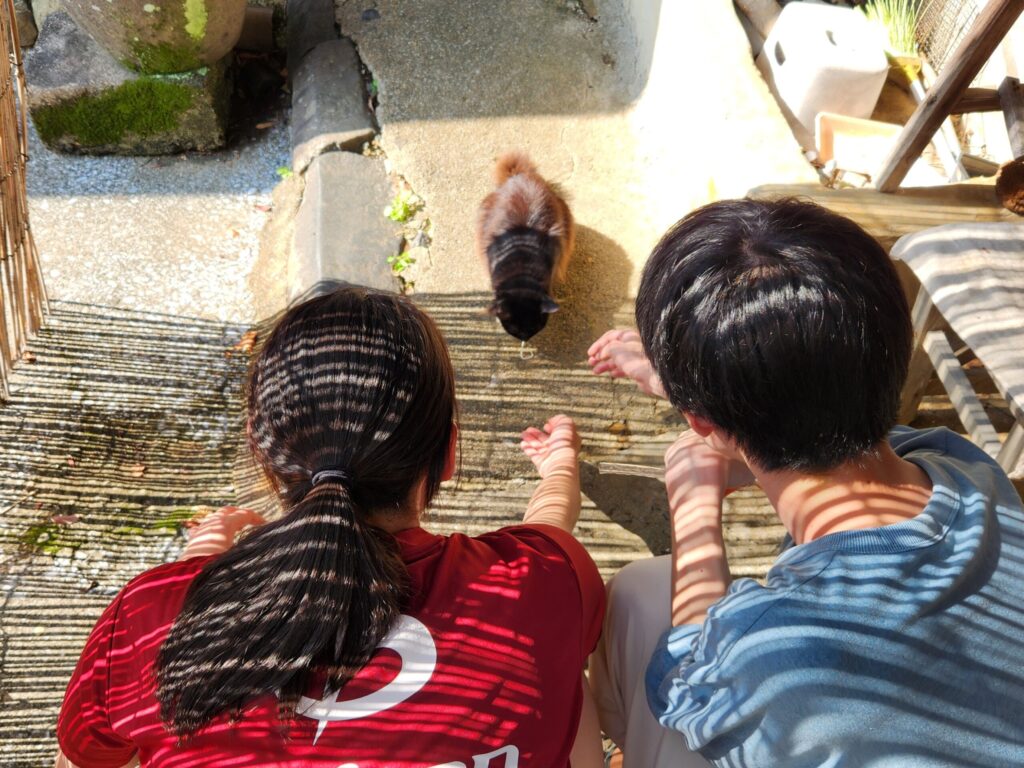 おばさんを呼ぶ「ニャー」という一声で、弟と妹は飛んでいき、「何やったらあげて良い?」と聞いて、「カニカマなら良いけど無い」とわかると近くのスーパーまで買いに行きました。